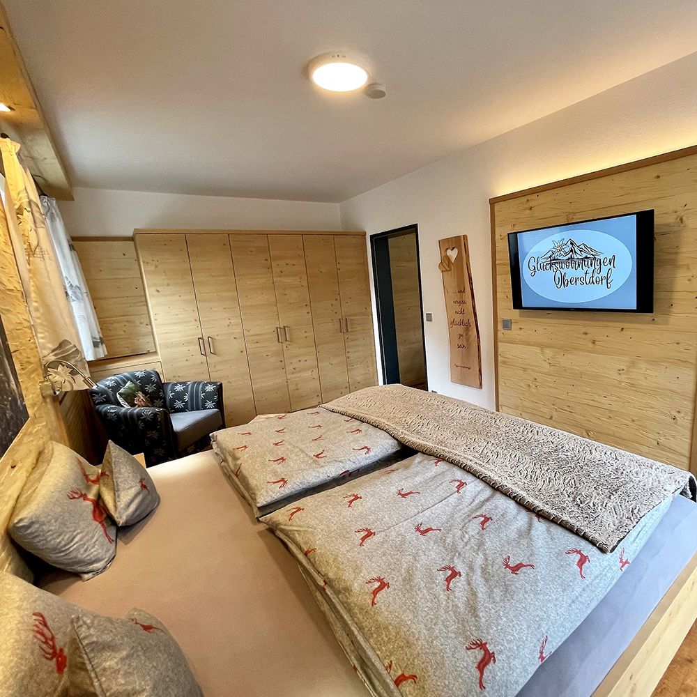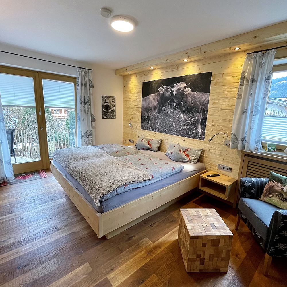 Das Schlafzimmer ist mit einem komfortablen, bequemem Doppelbett 2,00 m x 2,00 m mit hochwertigen Matratzen ausgestattet. Die Altholzrückwand mit einem eingebetteten Kuhbild und indirekter Beleuchtung ist eines der Highlights im Schlafbereich.