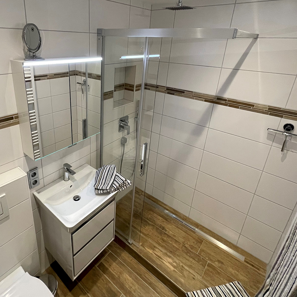 Das kleine aber moderne Bad ist mit einer begehbaren Regendusche, Fußbodenheizung und Handtuchheizkörper ausgestattet.